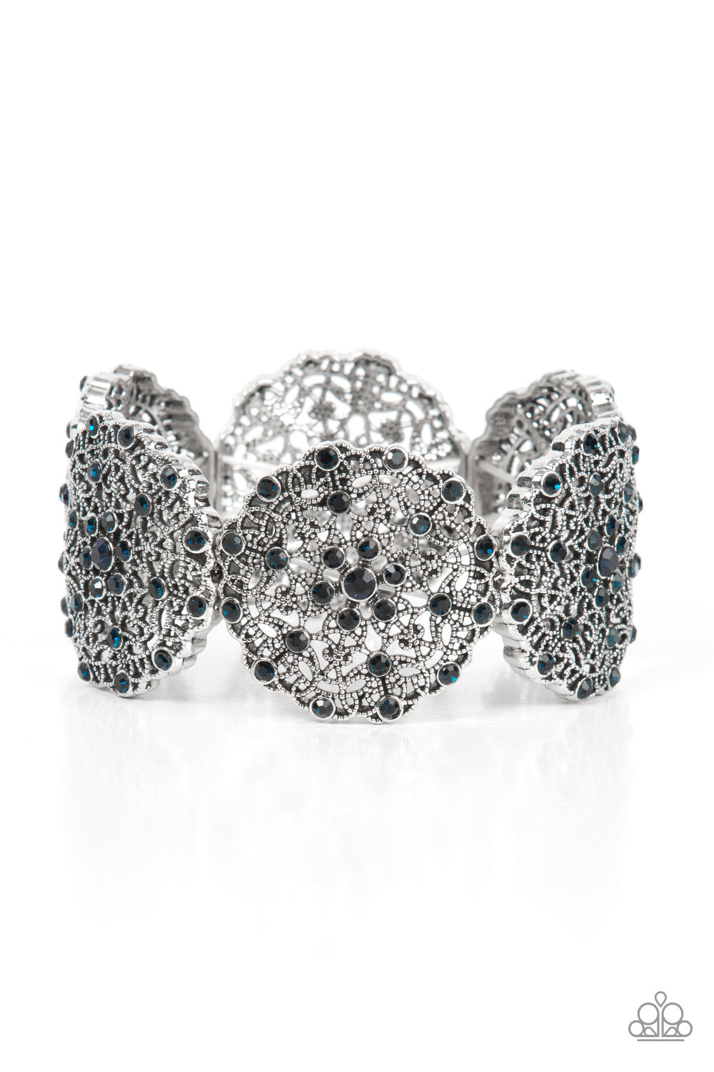 Dotted with glittery blue rhinestones, studded silver frames are filled with mandala-like filigree details and threaded along stretchy bands around the wrist for a glitzy pop of color.