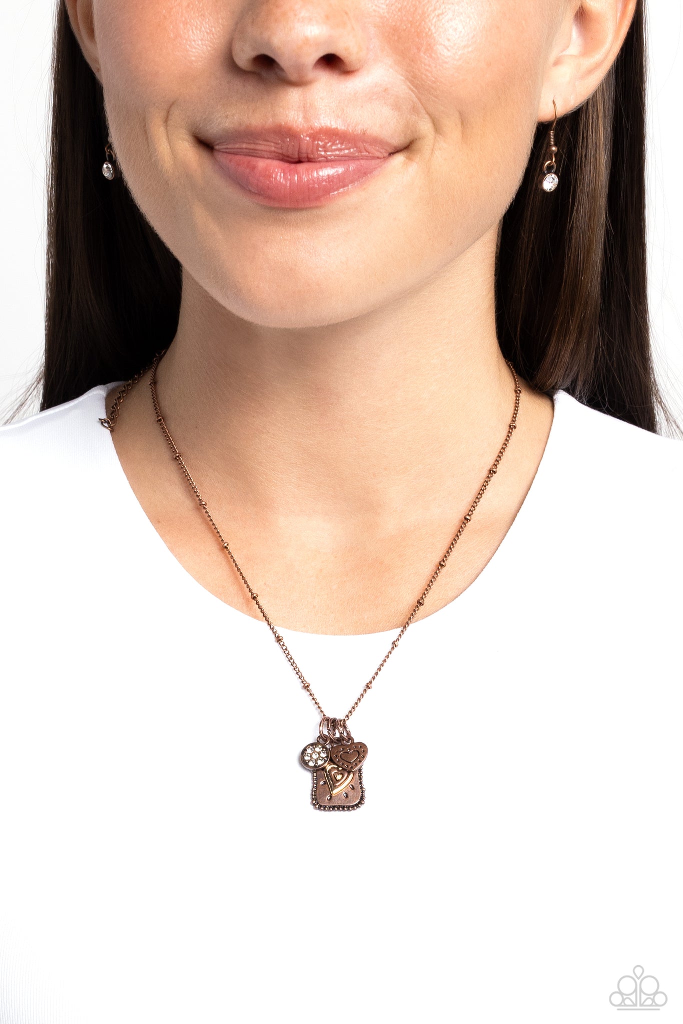 Featuring golden centers and embellished details, a textured copper layered heart, a stud-framed sun-burst pendant, and a floral white rhinestone-encrusted disc glides along a copper satellite chain. Featured in a cursive font, the back of the stud-framed pendant features the words “Live,” “Love,” and “Laugh” for an inspiring, vintage display. Features an adjustable clasp closure.
