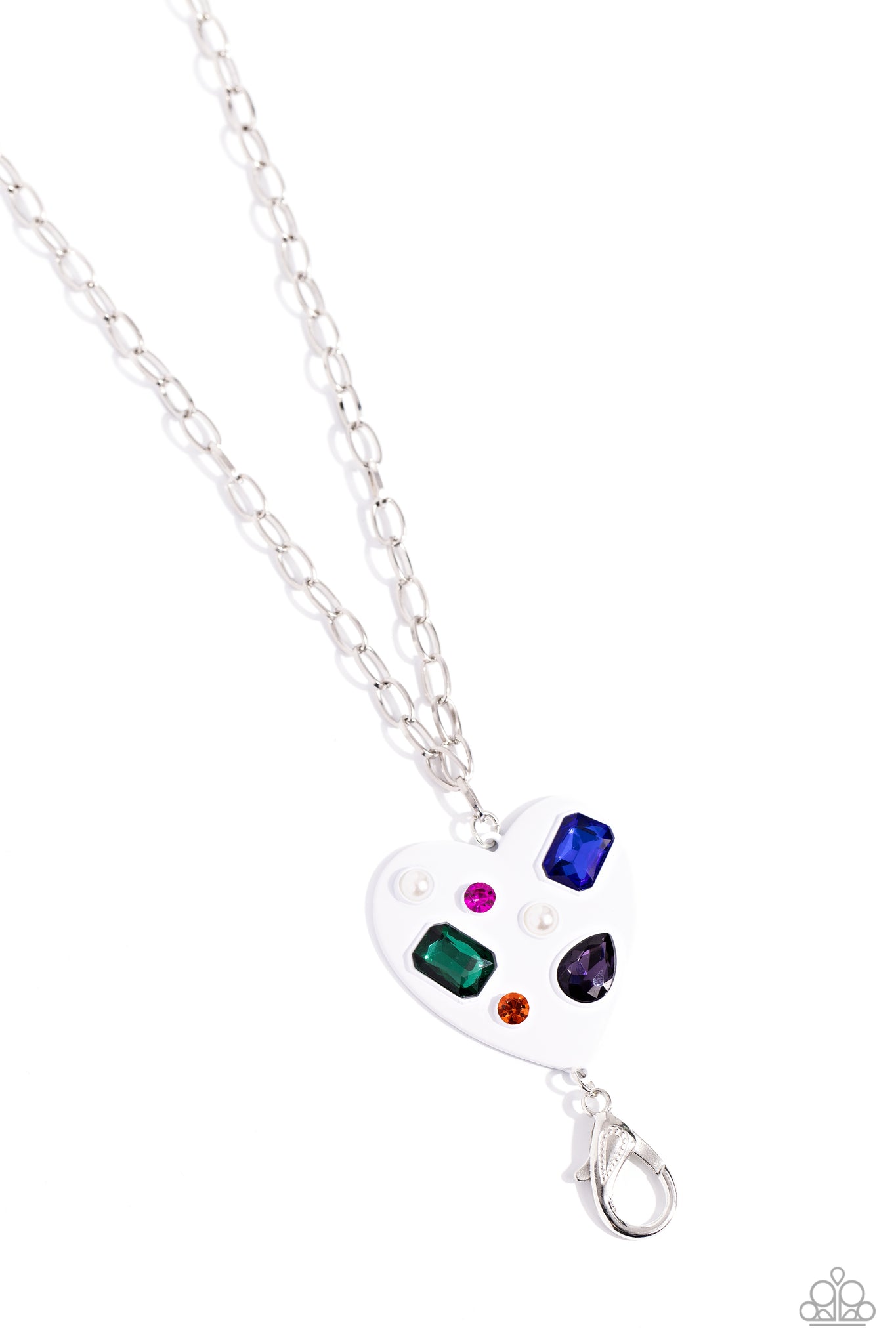 Falling down the neckline from a shimmery silver paperclip chain, an oversized white-painted heart rests for a romantic statement. Brushed with shimmery blue, purple, pink, orange, and green gems in round, teardrop, and emerald cuts, the colors sparkle and shine alongside dainty white pearls for a dazzling finish. A lobster clasp hangs from the bottom of the design to allow a name badge or other item to be attached. Features an adjustable clasp closure.