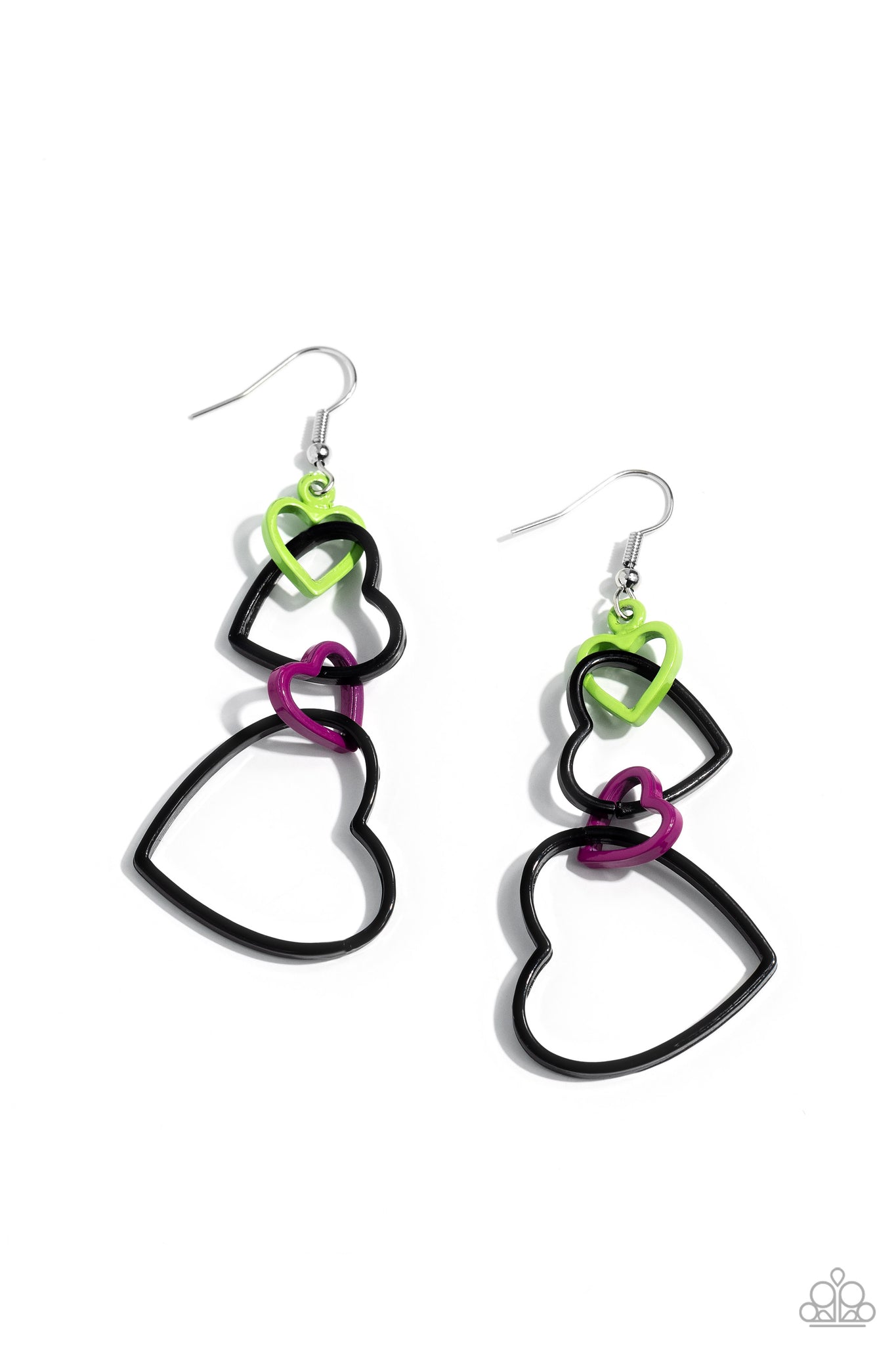 A collection of airy, heart-shaped silhouettes in varying sizes and Kohlrabi, black, and Rose Violet hues interlock and fall from the ear in a haphazard pattern, creating a sleek romantic cascade. Earring attaches to a standard fishhook fitting.