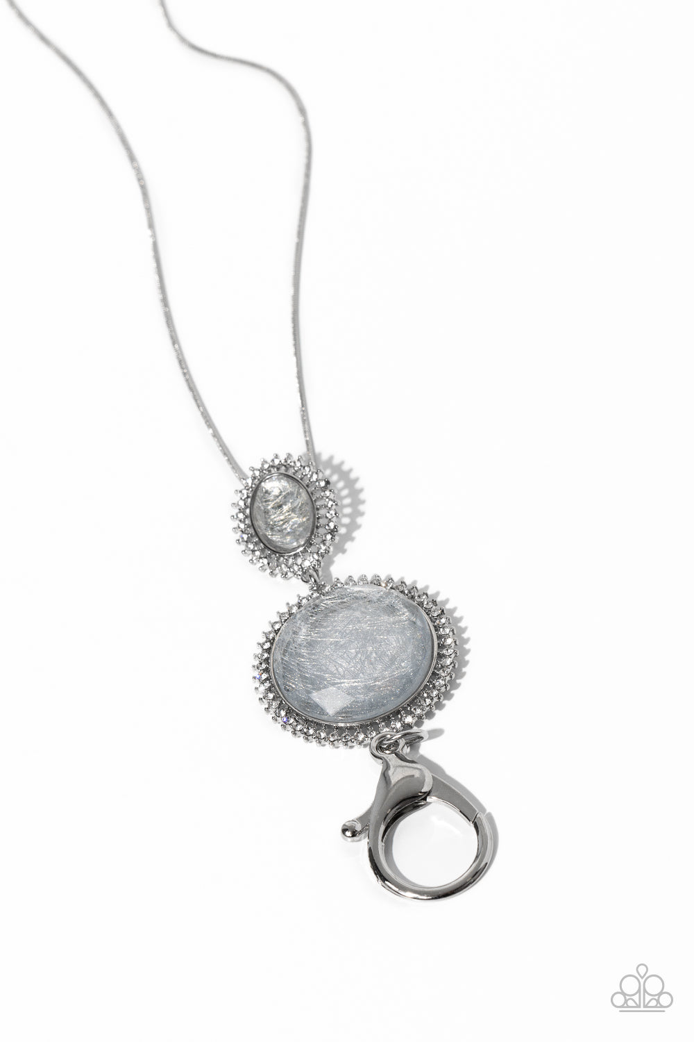 Featuring a scratched motif, a large white gem is encased in a border of rhinestone-dusted silver, as it's suspended from a smaller version of the same design but in an oval shape. The stacked pendant then slides along an elongated silver snake chain for a regal finish. A lobster clasp hangs from the bottom of the design to allow a name badge or other item to be attached. Features an adjustable clasp closure.
