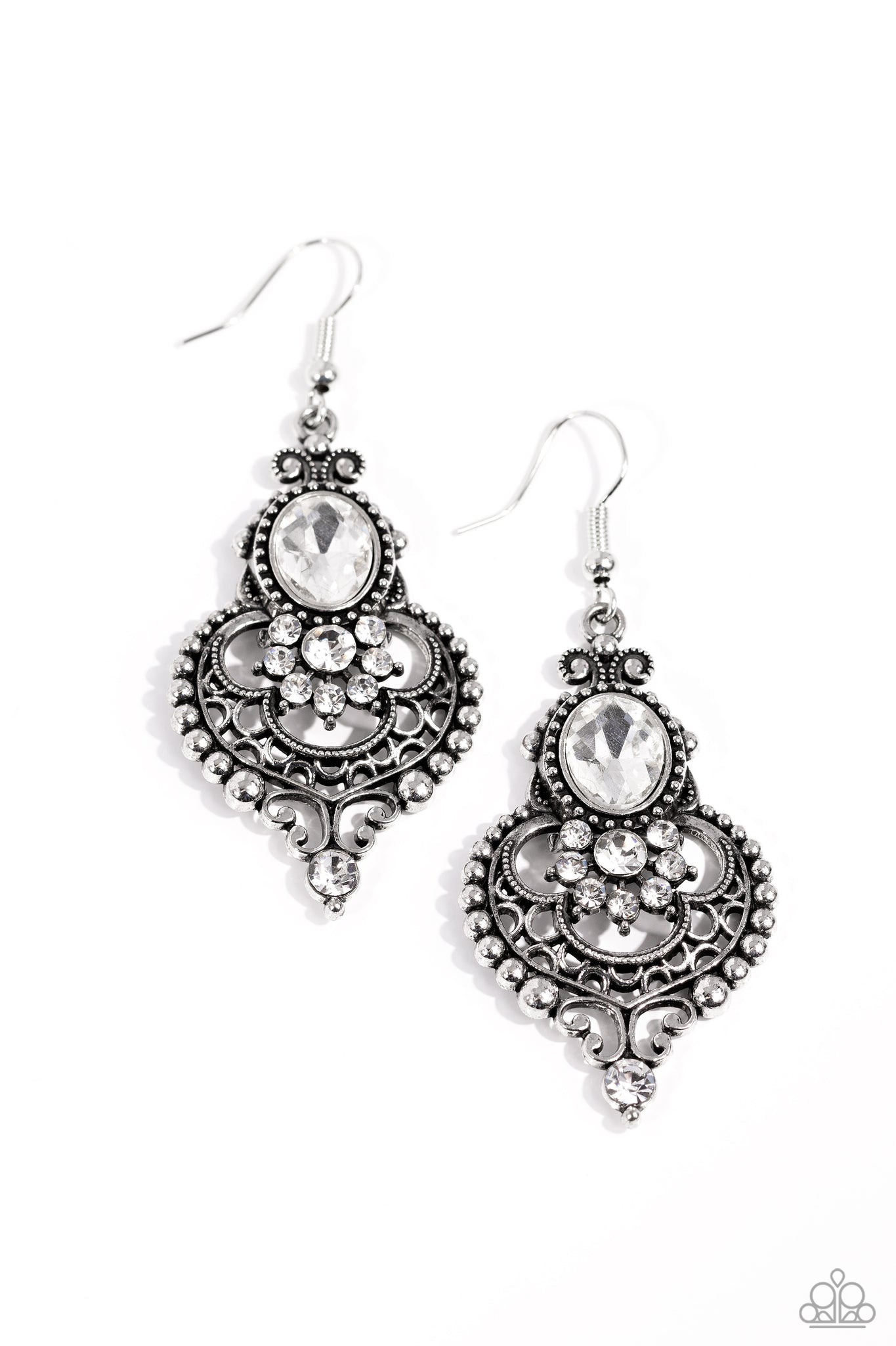 A white rhinestone floral accent flares out from the bottom of an oversized oval gem atop a studded backdrop of silver filigree, resulting in a regal lure. Earring attaches to a standard fishhook fitting.