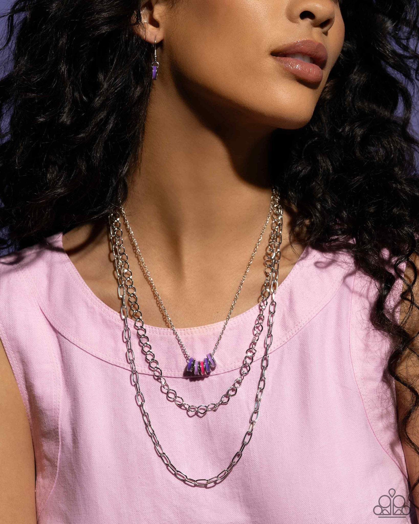 Three mismatched silver chains cascade and layer along the neckline for a sleek look. Strung along the uppermost dainty silver chain, a collection of hot pink, lavender, and purple-painted silver rings add an optimistic splash of color to the look. Features an adjustable clasp closure.